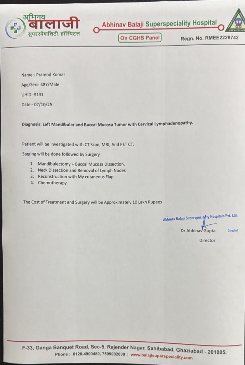 Doctors have advised a treatment that costs several lakhs, an amount impossible for Pramod to arrange. He is a daily wage laborer, with no steady income and no support system. The only person helping him now is a kind neighbor who himself is a laborer with a family to feed. He supports Pramod purely out of humanity and compassion, because Pramod has always been known as a gentle and kind man.